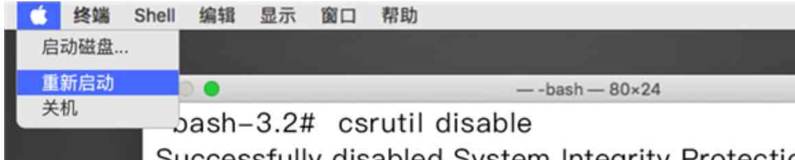 回车后会提示‘成功关闭了系统完整性保护,请重启机器’。 点击菜单栏苹果标志,选择‘重新启动’。